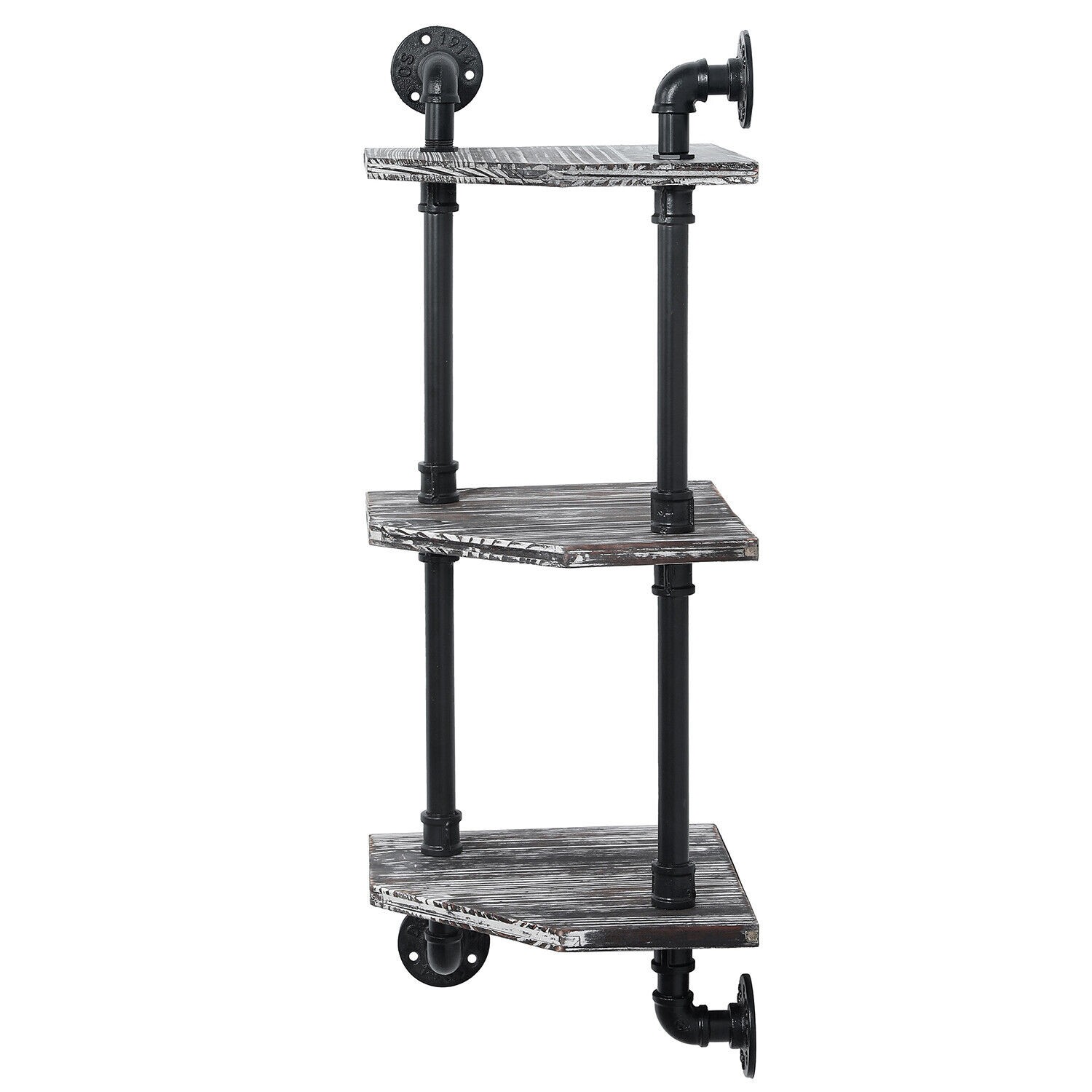 3 Tier Rustic Torched Wood Corner Display Shelves w/ Industrial Metal Pipe Frame