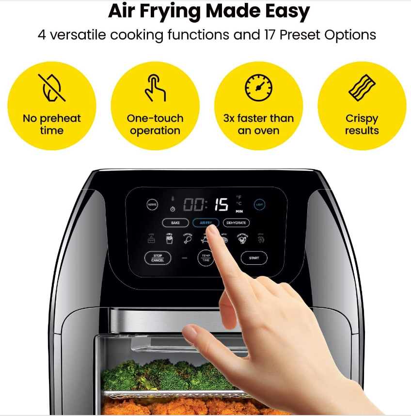 • Cook faster: No need to preheat like traditional ovens. This all-in-one convection oven uses rapid air heating elements to cook fast, even, and crispy food.