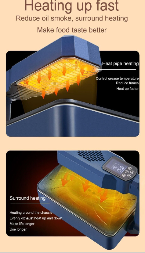 Control the temperature of grease, reduce oil fume, heat light far infrared heating, and heat up faster.