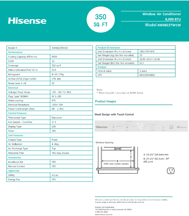 The Hisense AW0822TW1W Window Air Conditioner with inverter technology, best suited for smaller rooms (350 sq. ft. or less) with 8,000 BTU of cooling power, is packed with various efficient, easy to use features. Hisense inverter technology saves energy and maintains stable temperature at desired level by varying rotation speed of compressor. E-star certified air conditioner can reduce energy consumption, which in turn, helps to save money. With ConnectLife app on your mobile phone, you can turn on/off your air conditioner or adjust the setting wherever, whenever. The maintenance is simple thanks to the washable and removable filter.