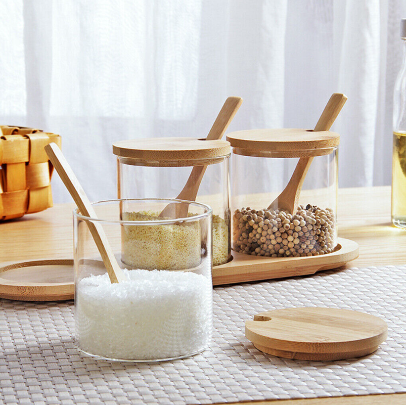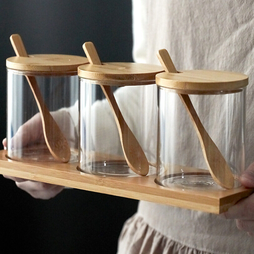 Spice bottles set includes 3 pieces glass Spice Jars, 3 Lids, and 3 spoon and 1 tray, simple and refillable.