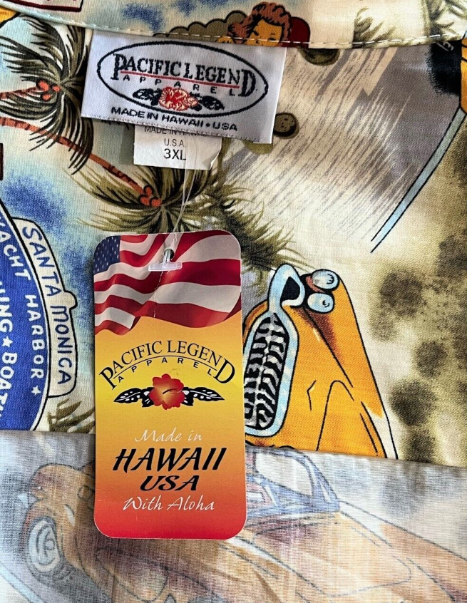 This new with original tag PACIFIC LEGEND  Route 66 Hawaiian Shirt is constructed of a cotton print of all of the Route 66 travel destinations accompanied by pin-up girls and cars!  Very colorful and graphic!  In excellent condition - new with tags.  Does have one spot on the front that might be a bit of color bleed - or it might be in the print.  Just thought i'd mention.  It is at the bottom left off the the "historic 66" sign.  Coconut buttons, single pocket, straight bottom.