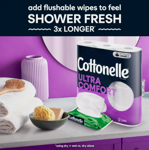 • Use toilet paper and flushable wet wipes together for a refreshing, shower fresh clean.